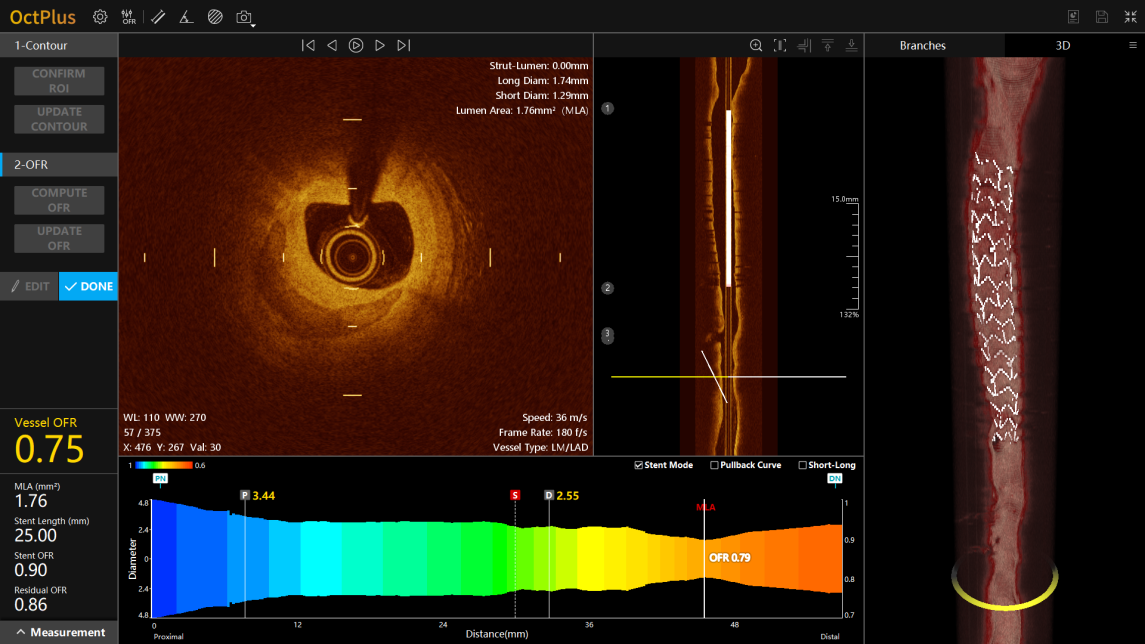 OFR(Optical Flow Ratio)由上海交通大学联合博动医学影像科技(上海)有限公司共同研发,是涂圣贤教授团队继QFR技术之后的又一重要创新成果。其成功转化的OFR测量系统(OctPlus)是具有完全中国自主知识产权的全球首个基于OCT的FFR评估产品,实现了通过一次OCT导管回撤,超快速完成斑块精细结构学和冠脉生理功能学FFR评估,辅助术前介入治疗策略的制定和PCI术中优化。