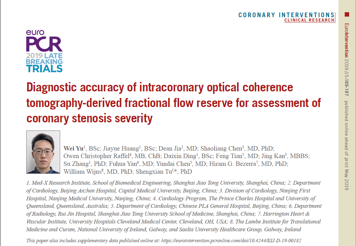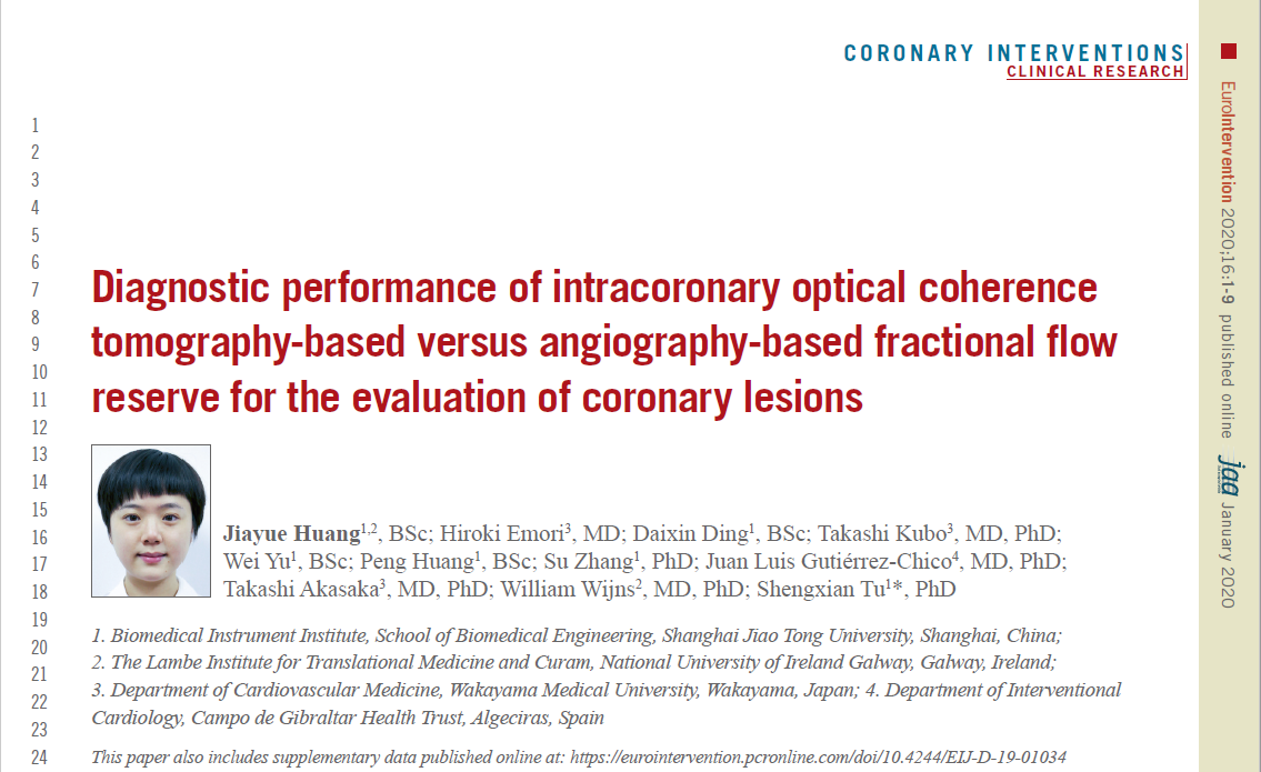2. Huang J, Emori H, Ding D, Kubo T, Yu W, Huang P, Zhang S, Gutierrez-Chico J L, Akasaka T, Wijns W, Tu S. Comparison of Diagnostic Performance of Intracoronary Optical Coherence Tomography-based and Angiography-based Fractional Flow Reserve for Evaluation of Coronary Stenosis. EuroIntervention :. 2020, 16:1-9 (原文链接)