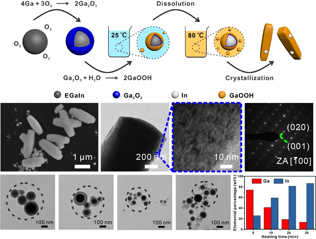 在电影《终结者》中,液态金属机器人能够改变自己的形态,给观众留下了深刻的印象。铟镓合金液态金属纳米机器人具有类似的变形能力,即在水中能够转变为微米尺度的羟基氧化镓棒状结构。这一奇特的现象已被研究者发现并运用到包括可控释药物载体在内的许多领域。然而迄今为止,这一变形现象的具体机理尚未得到清晰的解释。近日,伟德体育官网叶坚教授课题组对铟镓合金纳米颗粒的变形机理进行了详细的研究。研究团队通过精巧的实验设计和丰富的表征手段,证实了液态金属纳米颗粒经历了镓组分氧化并进一步与水反应生成可溶性羟基氧化镓的过程,而铟组分则会浓缩为单质纳米颗粒,并且这一过程在热的作用下会被进一步加速。这为镓基液态金属纳米材料在包括新型微纳机器人、纳米药物载体等领域的应用奠定了坚实的基础。此外,该工作还提出并证实了一种利用负电性分子来抑制镓基液态金属纳米材料表面氧化的方法,从而能够在纳米尺度下维持液态金属纳米颗粒优异的流变性能和导热、导电能力,为柔性微纳电子、可穿戴医疗设备等研究方向提供了理想的材料。相关研究成果以“Shape transformation mechanism of gallium-indium alloyed liquid metal nanoparticles”为题发表在《Advanced Materials Interfaces》上。
