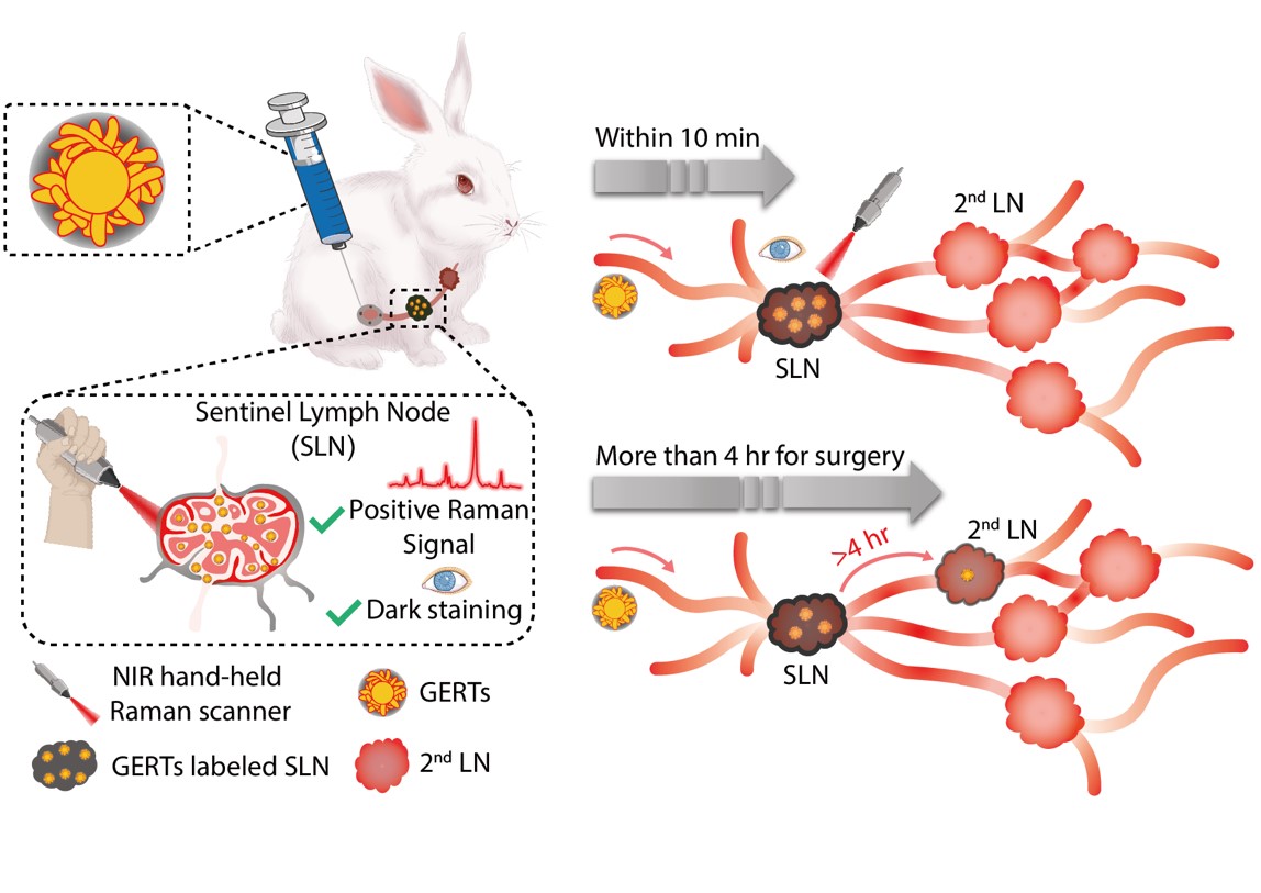 前哨淋巴结 (Sentinel lymph node, SLN) 是恶性肿瘤发生淋巴转移的第一站淋巴结,对恶性肿瘤区域淋巴结的转移情况及指导淋巴结清扫具有重要意义。通过前哨淋巴结活检可以在保证肿瘤安全性的同时,有效避免不必要的大范围淋巴清扫,减少淋巴水肿、感觉障碍等诸多并发症。随着诊断技术的发展,筛查的普及,目前临床中应用的前哨淋巴结定位技术包括染料法、放射性核素法和近红外荧光成像法,但均有其局限性,没有任何一种技术具有绝对优势。缝隙增强拉曼探针 (GERTs) 是多层核壳结构的新型纳米材料,具有信号强、特异性高、空间分辨率高、组织穿透力强、生物安全性好等优势。由于其合适的粒径大小,超高的信噪比,非常适合作为前哨淋巴结的示踪剂,从而实现对前哨淋巴结的精确定位。
