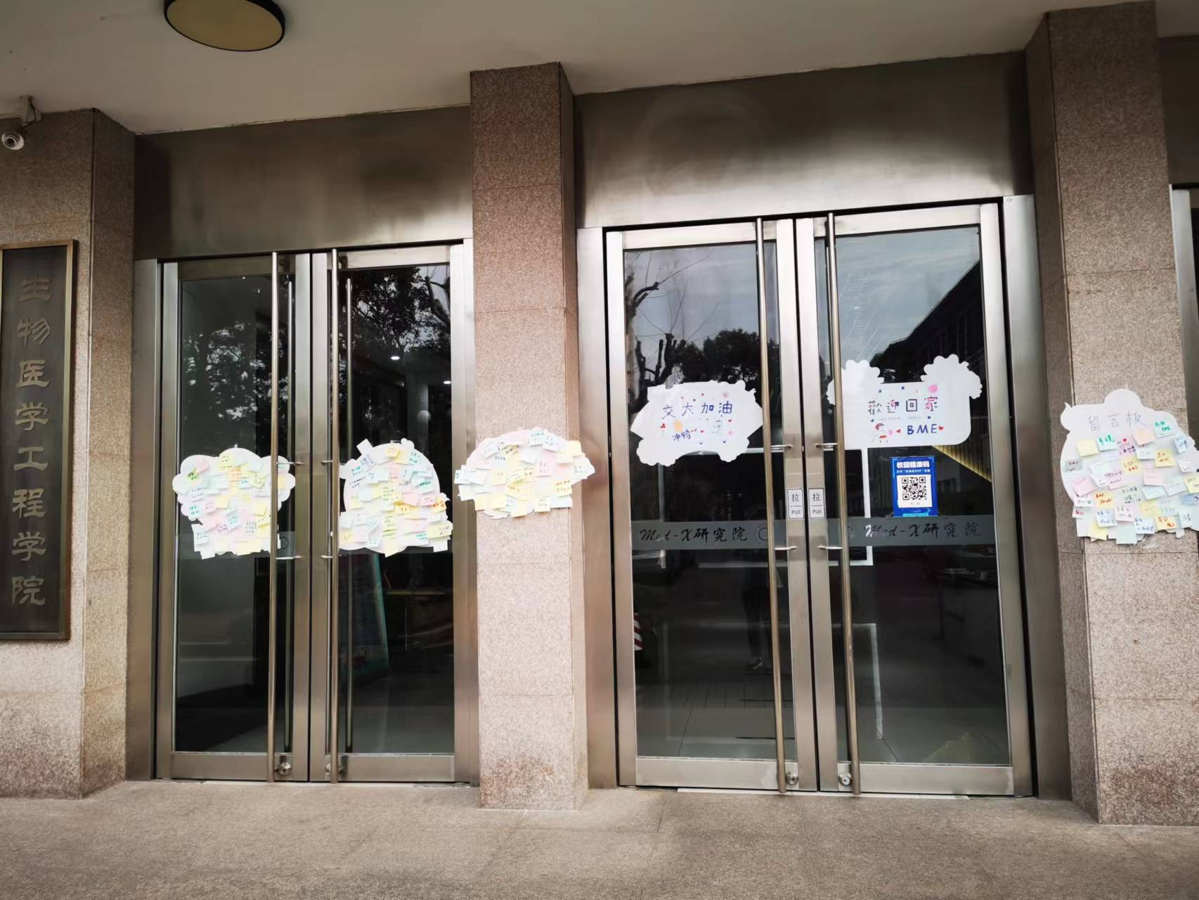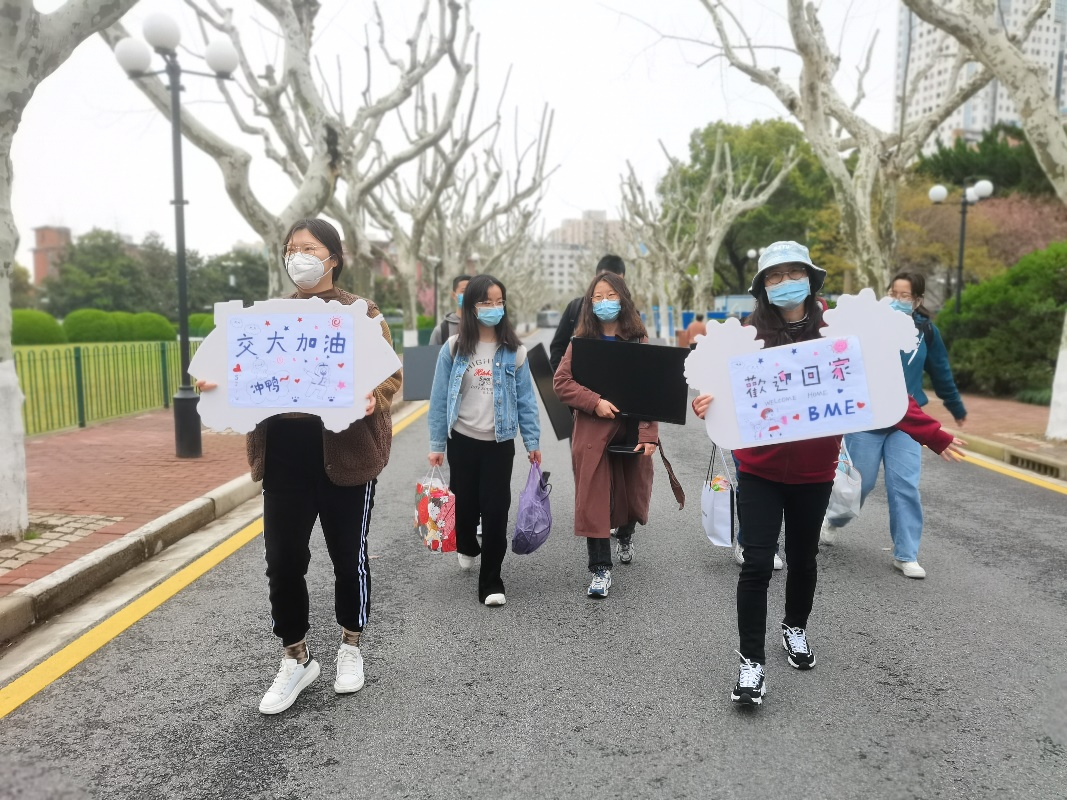 在封校期间,徐汇防疫小分队持续关注学生们的精神及物质需求,用爱为徐汇校区的我院学子筑起温暖的港湾。陆蕾及徐汇小分队成员积极筹备“欢迎回家”活动,组织同事利用有限的条件亲手绘制了两块欢迎板,前往校门口欢迎二十余名隔离后返校的学生回家。在寒冷的冬日为同学们带去了来自生医工大家庭的浓浓暖意。