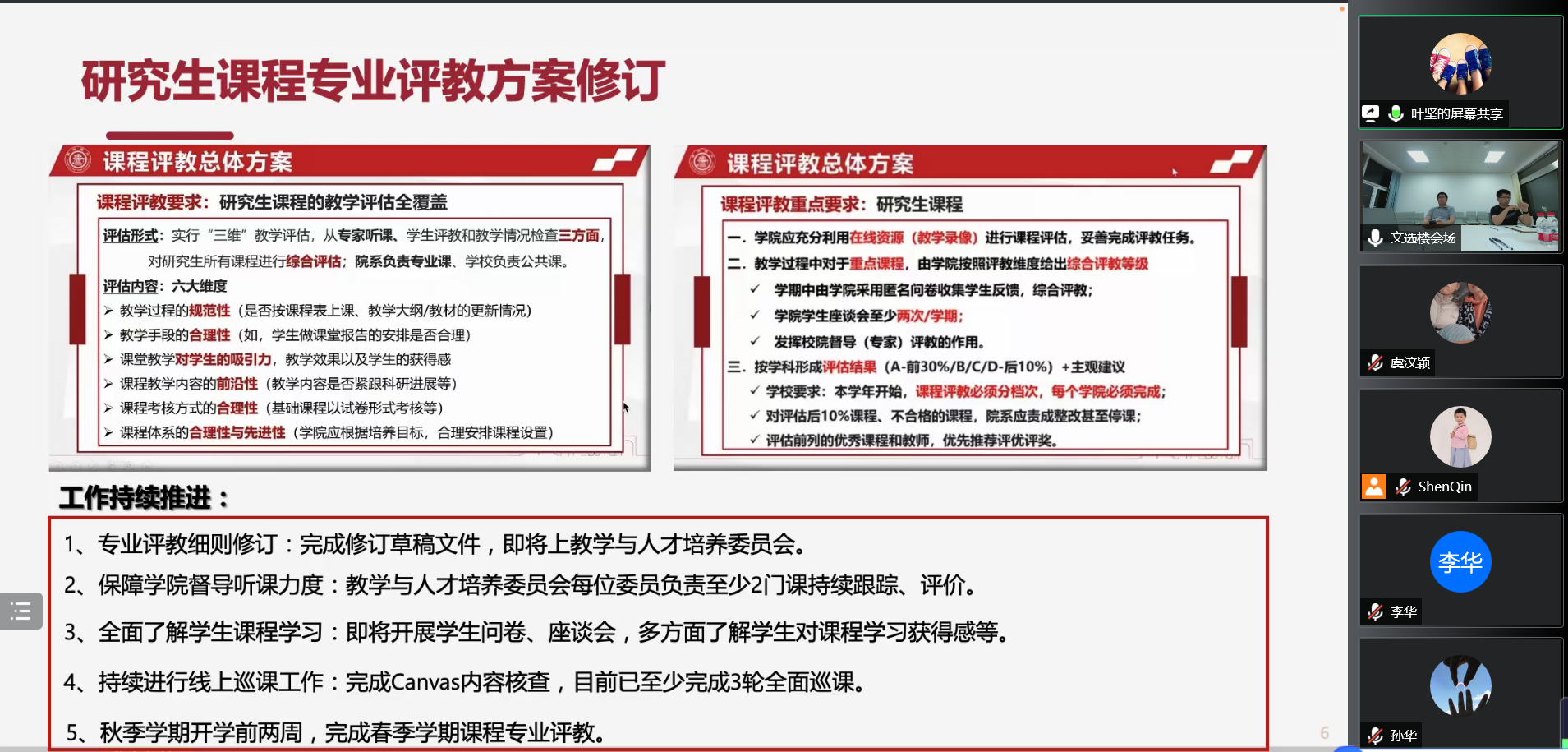 随后,白景峰及叶坚两位副院长分别介绍了本学期本科生及研究生教学工作的具体安排。白景峰从春季学期本科生期末考试工作安排及学生毕业设计工作时间节点要求两方面进行了详细的介绍;他建议学院教师适度调整、合理安排,保证线上教学的等质高效有序推进。叶坚随后全面介绍了关于研究生复试、博士生资格考试、2023年研究生优才夏令营、博士生名额预分配方案改革、研究生课程专业评教方案修订及2022年春季研究生课程在线教学考核管理办法等六方面的工作安排;他动员学院研究生导师切实担起育人责任,落实好特殊时期在研究生培养方面的各项工作。