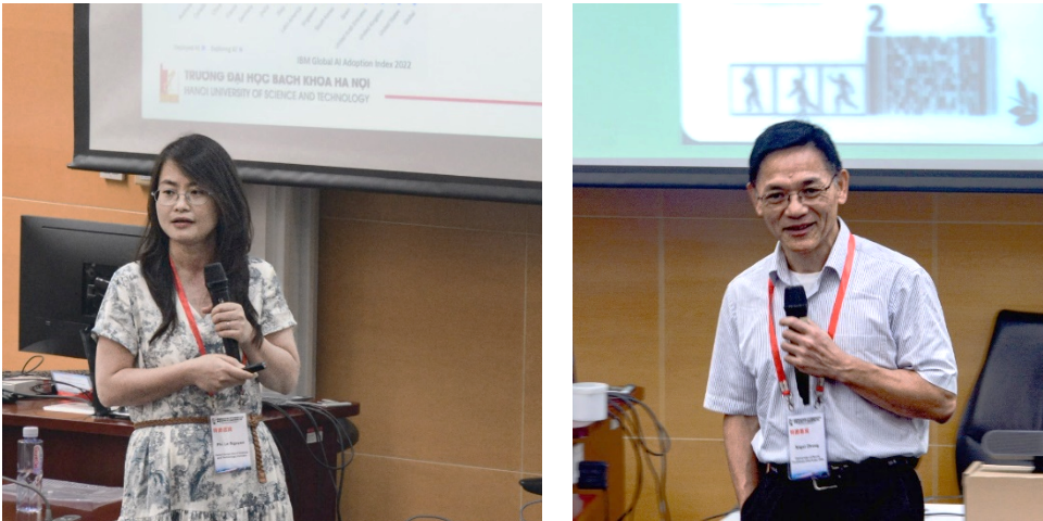 图3:越南河内科技大学Dr.Thuy Thi Ngoc Bui主持workshop;英国朴茨茅斯大学Raymond Lee教授、河内科技大学Nguyen Phi Le教授、美国北卡罗来纳大学夏洛特分校工学院Nigel Zheng教授和上海交通大学医学院附属第九人民医院顾冬云教授在做主题报告;专家教授对学员问题进行讨论解答