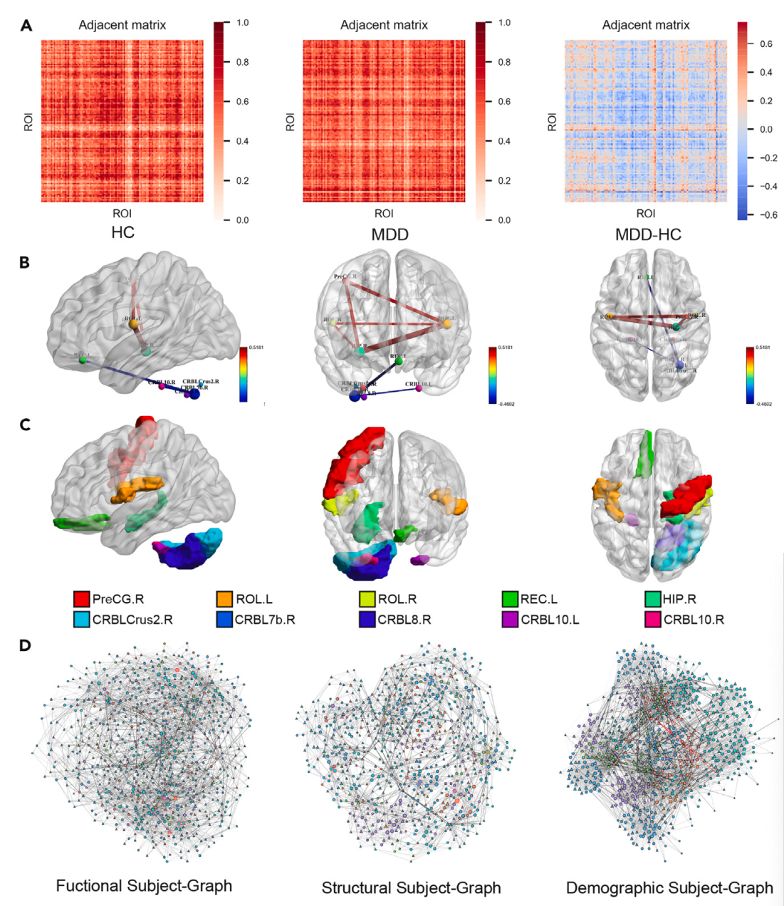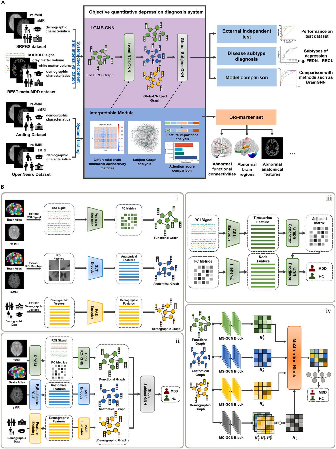 重度抑郁障碍(Major Depressive Disorder, MDD)对全球精神健康构成了多方面的挑战,其病因复杂,疾病发生发展涉及社会、心理和生物等多种因素。此外,该疾病目前缺乏明确的诊断标志物,医生临床诊断决策存在主观性强、误诊率高等问题。基于人工智能(AI)及数据驱动的诊断方法有望为该疾病提供更全面和客观的评价。然而,一方面,当前的AI方法往往忽视了脑功能、脑结构和人口统计因素之间复杂的相互作用,这些因素从多个方面对MDD患者的特征进行刻画;另一方面,当前方法很少整合来自细粒度的大脑区域分析和广泛的人口层面关联的见解,未能充分考虑症状学诊断和流行病学诊断两种医学诊断基本范式。此外,当前缺乏能够有效解释AI模型和识别诊断标记物的策略。因此,迫切需要改进网络架构、开发有效的多模态融合策略以及增强模型的可解释性。