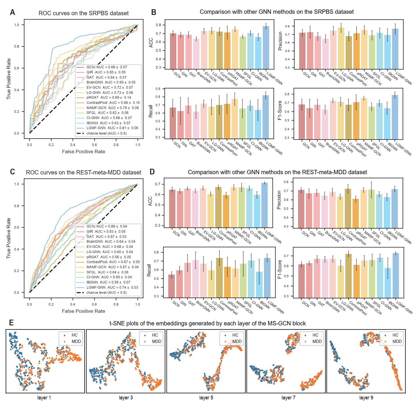 该研究在来自中国、日本和俄罗斯24个机构的1,182名健康对照组和1,260名MDD患者的队列中进行了模型构建及测试,取得了78.75%的分类准确率、80.64%的受试者工作特征曲线下面积(AUROC),并能够有效区分MDD亚型。对比实验显示, LGMF-GNN在MDD诊断中表现出最佳性能。相较于SOTA方法,LGMF-GNN在SRPBS数据集中实现了至少3.65%的ACC提升和5.39%的AUROC提升;在REST-meta-MDD数据集上实现了至少4.20%的ACC提升和5.18%的AUROC提升。相比之下,其他方法受站点效应(site effect)的影响较大,无法准确分类,ACC徘徊在70%左右。除MAMF-GCN外,其他对比方法的AUROC均小于75%。